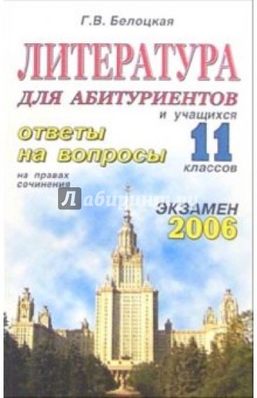 Ответы подготовлены преподавателем специального учебно-научного центра при МГУ Г.В. Белоцкой в соответствии с требованиями, предъявляемыми на вступительных экзаменах, и с учетом опыта реальной работы автора в течение многих лет в приемной комиссии филологического факультета МГУ, а также в приемных комиссиях других московских вузов и могут быть использованы как материал для экзаменационных сочинений.