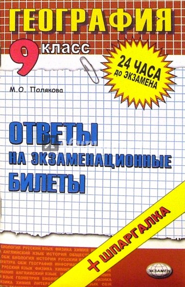 В данном пособии приводятся ответы на все вопросы экзаменационных билетов по географии, предлагаемых Министерством образования и науки РФ для проведения устной итоговой аттестации выпускников 9 классов общеобразовательных школ. В ответах на практические вопросы рассмотрены примеры решения типовых задач и примеры выполнения типовых заданий. Предлагаемые ответы полностью удовлетворяют требованиям, предъявляемым на экзаменах в школах, и помогут школьникам быстро и эффективно подготовиться к экзаменам, систематизировать и укрепить свои знания. В пособии содержатся шпаргалки к билетам. Для простого и эффективного использования шпаргалки разрежьте каждую страницу на четыре части по пунктирной линии. Сложите полученные листы по порядку номеров Д верхний левый, верхний правый, нижний левый, нижний правый. Для удобства использования можно скрепить получившуюся стопку степлером или скрепкой в верхнем левом углу. Пособие предназначено для учащихся и преподавателей 9 классов общеобразовательных школ.