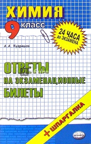 В данном пособии приводятся ответы на все вопросы экзаменационных билетов по химии, предлагаемых Министерством образования РФ для проведения устной итоговой аттестации выпускников 9-х классов общеобразовательных школ. В ответах на практические вопросы рассмотрены примеры решения типовых задач, знание которых необходимо для успешной сдачи экзаменов, а также примеры выполнения лабораторных опытов. Предлагаемые ответы полностью удовлетворяют требованиям, предъявляемым на экзаменах в школах, и помогут школьникам быстро и эффективно подготовиться к экзаменам, систематизировать и укрепить свои знания. В пособии содержатся шпаргалки к билетам. Пособие предназначено для учащихся и преподавателей 9-х классов общеобразовательных школ.