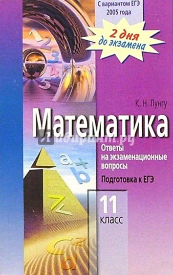 Пособие содержит ответы на вопросы 27 билетов устного экзамена по алгебре и началам анализа и 6 вариантов ЕГЭ по математике. Один вариант - образца 2005 года. Три варианта полностью разобраны.