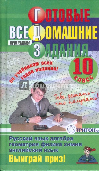 Настоящее пособие содержит выполненные домашние задания по русскому языку, алгебре, геометрии, физике, английскому языку для учащихся 10-х классов средних общеобразовательных школ, на базе учебников, используемых в подавляющем большинстве школ.
