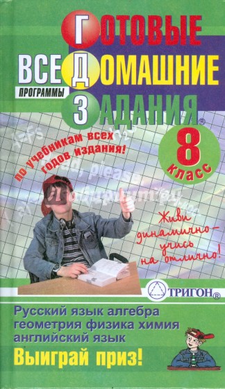 Настоящее пособие содержит выполненные домашние задания по русскому языку, алгебре, геометрии, физике, английскому языку для учащихся 8-х классов средних общеобразовательных школ, на базе учебников, используемых в подавляющем большинстве школ.