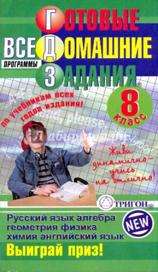 Настоящее пособие содержит выполненные домашние задания по русскому языку, алгебре, геометрии, физике, английскому языку для учащихся 8-х классов средних общеобразовательных школ, на базе учебников, использующихся в подавляющем большинстве школ.