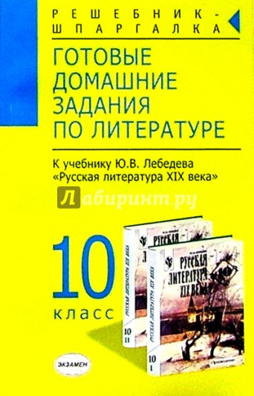 В пособии содержатся готовые домашние задания по литературе к учебнику "Русская литература XIX века. 10 кл. Учеб. для общеобразоват. учреждений. В 2 ч. / Ю.В.Лебедев. - 4-е изд. - М.: Просвещение, 2003".