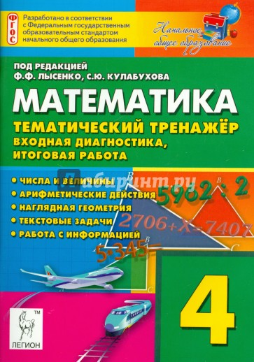 Пособие предназначено учащимся 4-х классов для работы в школе и дома, а также учителям для организации каждодневной тренировки детей в устных и письменных вычислениях. Форма тренировочной тетради делает издание универсальным подспорьем в образовательном процессе и даёт возможность работы с любым УМК по математике. В 5-ом классе пособие можно использовать для входной диагностики в начале учебного года.