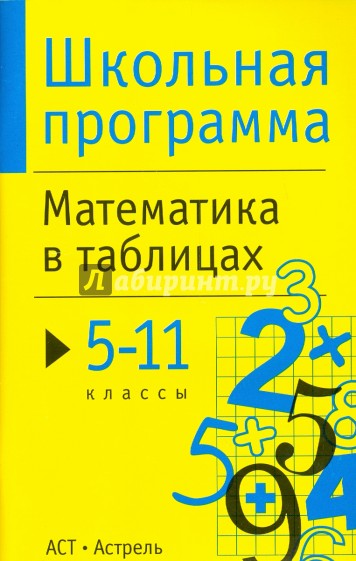 Справочный материал по всему школьному курсу математики в 5-11 классах сгруппирован в тематические таблицы. Весь материал распределен в соответствии с содержанием школьных предметов - математика, алгебра, геометрия - по разделам, адресованным школьникам 5-6 классов, 7-9 и 10-11.