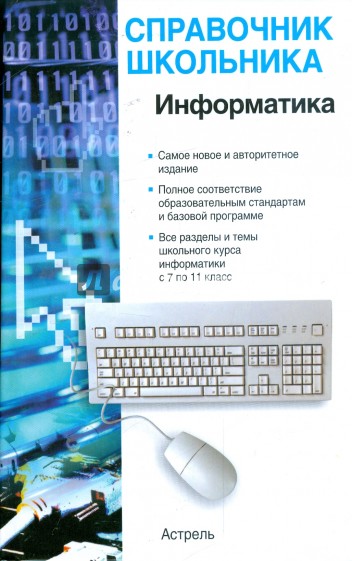 Справочник включает основные сведения школьного курса информатики с 7 по 11 класс в соответствии с современным стандартом для общеобразовательных учебных заведений. Подробно раскрыты главные темы предмета: информация, информационные процессы, представление информации, системы счисления, основы математической логики, компьютер и его составляющие, моделирование, алгоритмизация и программирование, технологии обработки текста и графики, компьютерные коммуникации. Теоретический материал подкреплен наглядными примерами, схемами и иллюстрациями. В конце пособия приведен указатель терминов, что существенно облегчает работу с книгой. Справочник будет незаменимым настольным пособием для школьников и тех, кто только что знакомится с азами информатики, а так же для более опытных пользователей ПЭВМ.