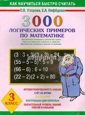 Пособие содержит 3000 логических примеров по математике для 3 класса по темам "Внетабличное умножение и деление без скобок", "Табличное умножение и деление со скобками", "Внетабличное умножение и деление со скобками".