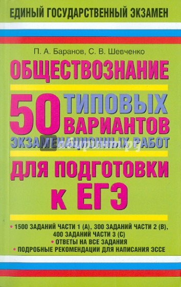 Вниманию школьников и абитуриентов впервые предлагается учебное пособие для подготовки к ЕГЭ, которое содержит 50 вариантов типовых экзаменационных работ. Каждый вариант составлен в полном соответствии с требованиями единого государственного экзамена, включает задания разных типов и уровня сложности по всем базовым наукам, на основе которых формируется курс обществознания: философии, экономике, социологии, политологии, социальной психологии, правоведению. Значительный по объему банк экзаменационных материалов (1500 заданий части А, 300 - части В, 400 - части С) предоставляет отличную возможность для интенсивной тренировки и овладения необходимыми для успешной сдачи ЕГЭ умениями и навыками. В конце книги даны ответы для самопроверки на все задания частей А и В, основное содержание ответов на задания части С и подробные рекомендации для написания эссе.