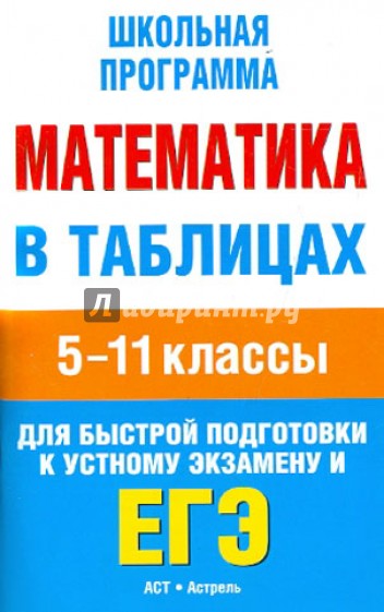 Справочный материал по всему школьному курсу математики в 5-11 классах сгруппирован в тематические таблицы. Весь материал распределен в соответствии с содержанием школьных предметов - математика, алгебра, геометрия - по разделам, адресованным школьникам 5-6 классов, 7-9 и 10-11.