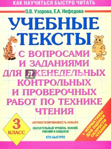 В пособии приведено 32 текста с контрольными вопросами, определенным количеством слов и нормативами оценки техники чтения для еженедельных и контрольных работ в 3 классе.