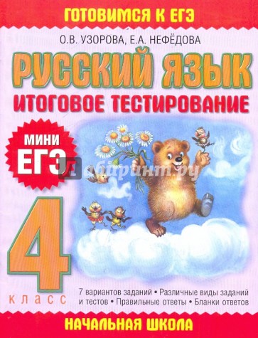 Учителям и родителям! Семь вариантов итоговых тестов за весь курс русского языка 4 класса. С их помощью можно не только проверить необходимый базовый уровень знаний, умений и навыков, но и научить правильно оформлять работу по принципам ЕГЭ. Старшие школьники испытывают большие трудности во время ЕГЭ не только с быстрым и правильным решением задания, но и способом его оформления. Ведь для записи ответа перед учеником целый лист незнакомых, непонятных клеток, граф, обозначений, сокращений. Поэтому важная цель этого пособия: с первого класса приучить школьника к одному из ведущих видов контроля за успеваемостью - тестированию и научить правильному и грамотному оформлению ответов.
