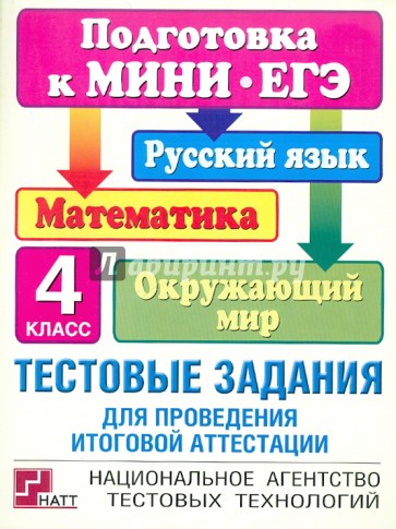Сборник содержит тестовые задания для проведения итоговой аттестации учеников 4 классов по русскому языку, математике и окружающему миру. Задания позволят проверить освоение учебных программ по основным предметам школьного курса, знания, предметные и общеучебные умения, необходимые для успешного продолжения обучения в основной школе.