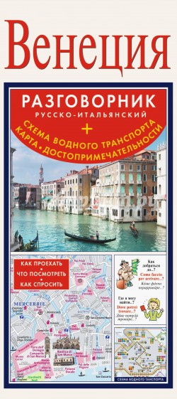 На одной стороне листа - карта города с путеводителем, на другой стороне - краткий русско-итальянский разговорник. На карте наглядно представлена историческая часть города, расположенная на островах и каналах и наиболее интересная в архитектурном и культурном смысле. Цветом выделены интересные туристические объекты, выражаемые в масштабе карты, вокзал, парки, многочисленные каналы, являющиеся транспортными артериями города. Целый ряд достопримечательностей (театры, церкви, отели) показан внемасштабными знаками. Наиболее известные здания и сооружения даны рисунками. На основной карте даны остановки вапоретто (маршрутных катеров) и гондольеров. Карта окаймлена описаниями некоторых основных достопримечательностей Венеции.