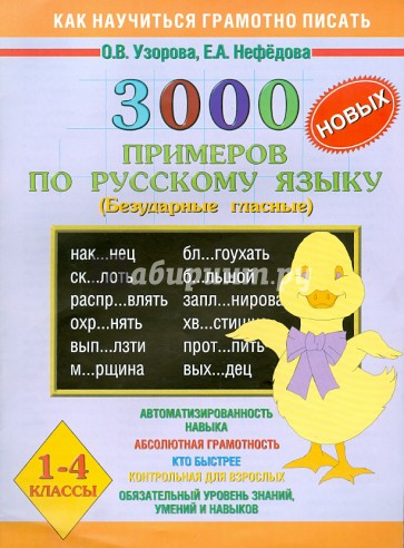 Практическое пособие включает 3000 примеров на повторение и закрепление темы "Безударные гласные" - одной из основных орфограмм, изучаемых в курсе русского языка для начальной школы. Доступное и удобное построение примеров позволяет быстро выполнить большое количество тренировочных заданий и легко проверить результаты.