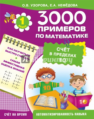 В пособии собрано 3000 новых примеров по математике по одной из базовых для первого класса тем - "Счет в пределах 10". Как и любая другая тема, она требует внимательного осмысления и прочного закрепления. Особенностью этого издания является крупный шрифт.