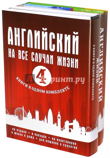 "Английский на все случаи жизни" - это комплект из четырех нужных для каждого книг. "Ускоренный курс английского" поможет быстро освоить необходимые слова и фразы для общения. "1000 английских слов" - это хороший тренинг. Закрываете слово красной закладкой, оно становится невидимым. Вы произносите правильно слово, опираясь на русский перевод, и проверяете себя. Также в комплекте вы найдете словарь и разговорник, которые выручат вас в любой ситуации - и на учебе и на отдыхе.