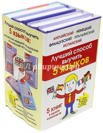 В комплект входят 5 книг: "Самый быстрый способ выучить испанский язык", "Самый быстрый способ выучить французский язык", "Самый быстрый способ выучить итальянский язык", "Самый быстрый способ выучить немецкий язык", а также "Мои первые 500 английских слов". Эти учебные словари позволяют в кратчайшие сроки овладеть пятью языками. Благодаря практической транслитерации, передающей звуки иностранного языка русскими буквами, читатель сразу начинает произносить новые слова. В каждой из книг приводятся примеры употребления слов в современной повседневной речи с переводом на русский язык. А кроме того специальная закладка-тест дает возможность контролировать и проверять, насколько успешно усвоен учебный материал.