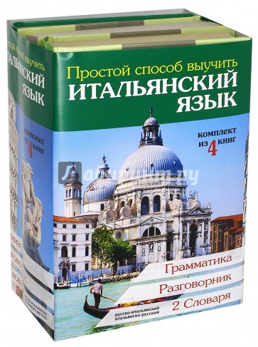 В комплект из четырех книг вошли: «Самый наглядный и удобный русско-итальянский разговорник», «Вся итальянская грамматика за 4 недели» С. Матвеева и два словаря – итальянско-русский и русско-итальянский. В разговорнике материал организован по тематическому принципу. Приводятся наиболее употребительные слова и выражения, которыми можно воспользоваться в самых разных ситуациях. Картинки и комиксы облегчают понимание и запоминание лексики и фраз. Это пособие удачно дополняет базовый курс итальянской грамматики, который содержит всю необходимую информацию о строе и особенностях итальянского языка. И наконец, словари помогут при чтении и переводе текстов средней сложности.
