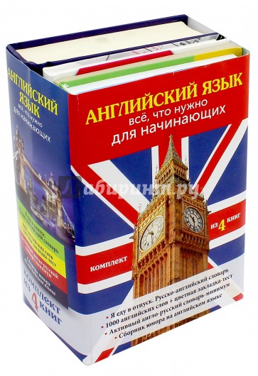В комплект входят 4 нужные книги по английскому языку для начинающих: "Я еду в отпуск. Русско-английский словарь", "1 000 английских слов", "С войной не шутят? Сборник юмора на английском языке", "Активный англо-русский словарь-минимум".