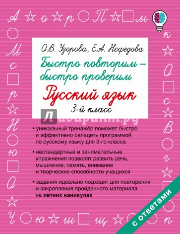 Учебное пособие известных педагогов-практиков О.В. Узоровой и Е.А. Нефёдовой "Быстро повторим - быстро проверим. Русский язык. 3-й класс" поможет школьнику приобрести теоретические знания и автоматизировать навыки грамотного письма. Нестандартные и занимательные упражнения на полях книги позволят развить речь, мышление, внимание, память и творческие способности ребёнка. Пособие можно использовать для работы дома и в классе по всем федеральным программам начальной школы.
