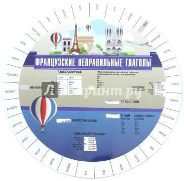 В этом диске-вертушке представлены 30 французских неправильных глаголов (с русским переводом значения каждого). Это модели спряжения, по которым могут спрягаться и другие глаголы с аналогичными окончаниями, входящие в III группу. Диск-вертушка позволяет быстро найти нужные глагольные формы, а они включают инфинитив, настоящее и будущее время, условное и сослагательное наклонения. Кроме того, даны причастия прошедшего времени (Participe Passe) для этих глаголов. В отдельные таблицы выделено сложное прошедшее время (Passe Compose), а также спряжение глаголов avoir и etre.