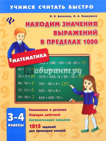 Пособие содержит 1015 заданий, направленных на отработку навыков решения примеров в пределах 1000.