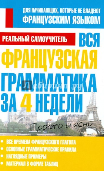 "Вся французская грамматика за 4 недели" - это базовый курс французской грамматики. В простой и доступной форме даны все грамматические правила, спряжение глаголов во всех временных формах. В качестве справочного аппарата в пособии дано большое количество таблиц, облегчающих восприятие материала, а также много полезных примечаний. Приложение содержит большое количество познавательной информации, в том числе об особенностях спряжения неправильных французских глаголов.