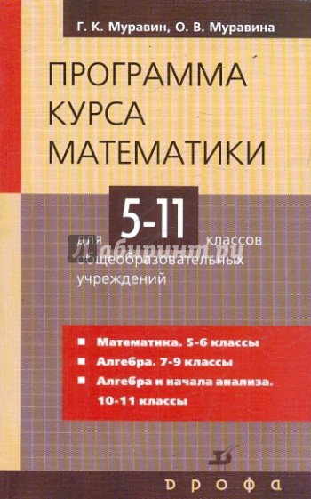 Программа курса математики является частью учебно-методического комплекта по математике для 5-11 классов авторов Г.К.Муравина и других. Программа соответствует федеральному компоненту государственного стандарта общего образования.