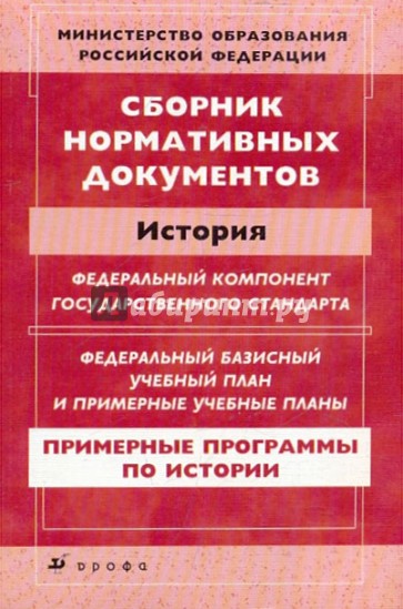 Сборник включает документы, адресованные учителям истории: федеральный компонент государственного стандарта общего образования по истории; федеральный базисный учебный план и примерные учебные планы основного общего и среднего (полного) общего образования по истории (базовый и профильный уровень); примерные программы по истории основного общего и среднего (полного) общего образования (базовый и профильный уровень).