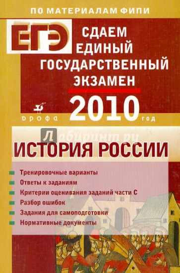 Пособие предназначено для подготовки к сдаче единого государственного экзамена (ЕГЭ) по истории России. Оно адресовано учителям, учащимся и их родителям. Пособие знакомит со структурой и содержанием контрольных измерительных материалов (КИМ), с типами заданий и формами записи ответов. Тренировочные варианты помогут школьникам приобрести навыки работы с различными типами заданий, представленными в ЕГЭ. Для успешной подготовки к сдаче экзамена можно использовать помещенные в пособии задания по основным темам школьного исторического курса.