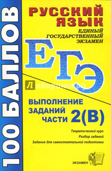 В пособии представлен: теоретический материал, необходимый для выполнения заданий части В Единого государственного экзамена по русскому языку, разборы заданий, тестовые задания для тренировки и проверки уровня своей подготовленности, типовые тестовые задания части 2 (В). Книга рассчитана на старшеклассников, выпускников школ и учителей русского языка.