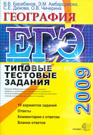 Типовые тестовые задания по географии содержат 10 вариантов комплектов заданий, составленных с учетом всех особенностей и требований Единого государственного экзамена в 2009 году. Назначение пособия - предоставить читателям информацию о структуре и содержании КИМ 2009 г. по географии, степени трудности заданий. Авторы заданий - ведущие ученые, преподаватели и методисты, непосредственно разработавшие как демонстрационную версию, так и сами тесты ЕГЭ 2009 года. В сборнике даны ответы на все варианты тестов и приводятся решения всех заданий одного из вариантов. Кроме того, приведены образцы бланков, используемых на ЕГЭ для записи ответов и решений. Пособие предназначено учителям для подготовки учащихся к экзамену по географии (не только к единому, но и к традиционному письменному), а учащимся-старшеклассникам и абитуриентам - для самоподготовки и самоконтроля.
