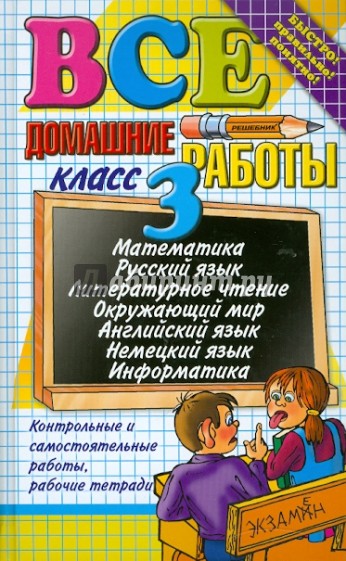 В данном учебном пособии решены и в большинстве случаев подробно разобраны задачи и упражнения по РУССКОМУ ЯЗЫКУ, МАТЕМАТИКЕ, ЛИТЕРАТУРНОМУ ЧТЕНИЮ, ОКРУЖАЮЩЕМУ МИРУ, ИНФОРМАТИКЕ, НЕМЕЦКОМУ и АНГЛИЙСКОМУ ЯЗЫКУ из ВСЕХ основных учебников начальной школы для 3 класса.