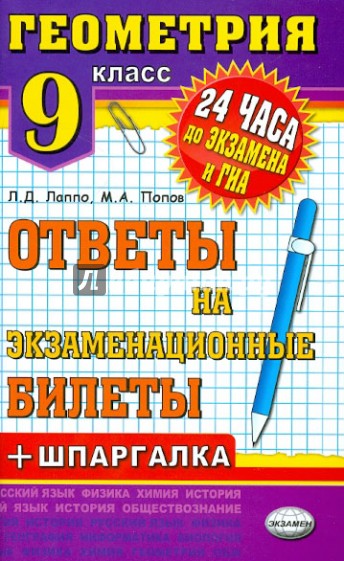 В данном пособии приводятся ответы на все вопросы экзаменационных билетов по геометрии, предлагаемых Министерством образования и науки РФ для проведения устной итоговой аттестации выпускников 9 классов общеобразовательных школ. В ответах на практические вопросы рассмотрены примеры решения типовых задач, знание которых необходимо для успешной сдачи экзаменов. Предлагаемые ответы полностью удовлетворяют требованиям, предъявляемым на экзаменах в школах, и помогут школьникам быстро и эффективно подготовиться к экзаменам, систематизировать и укрепить свои знания. В пособии содержатся шпаргалки к билетам. Для простого и эффективного использования шпаргалки разрежьте каждую страницу на четыре части по пунктирной линии. Сложите полученные листы по порядку номеров - верхний левый, верхний правый, нижний левый, нижний правый. Для удобства использования можно скрепить получившуюся стопку степлером или скрепкой в верхнем левом углу. Пособие предназначено преподавателям и учащимся 9 классов общеобразовательных школ.