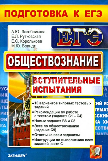 Предлагаемое пособие поможет выпускникам подготовиться к сдаче Единого государственного экзамена по обществознанию. Книга содержит общие сведения о Едином государственном экзамене по обществознанию, 16 вариантов типовых тестовых заданий, созданных по аналогии с заданиями ЕГЭ, рекомендации по выполнению заданий с текстом, содержащим социальную информацию (С1-С4), по написанию эссе (мини-сочинений), а также словарь терминов и понятий. Ко всем заданиям даны ответы и подробные инструкции выполнения всех заданий части С.Пособие предназначено учителям для подготовки учащихся к ЕГЭ по обществознанию, а также учащимся - старшеклассникам и абитуриентам - для самоподготовки и самоконтроля.