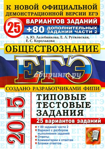 Пособие содержит 25 вариантов типовых тестовых заданий по обществознанию, а также 80 дополнительных заданий части 2. Все задания составлены с учетом особенностей и требований Единого государственного экзамена в 2015 году.