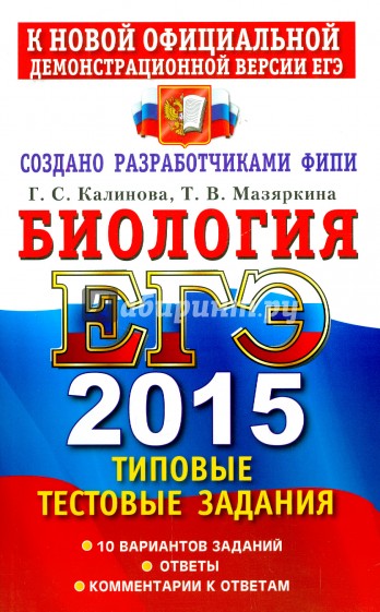 Типовые тестовые задания по биологии содержат 10 вариантов комплектов заданий, составленных с учетом всех особенностей и требований Единого государственного экзамена в 2015 году. Назначение пособия - предоставить читателям информацию о структуре и содержании контрольных измерительных материалов 2015 г. по биологии, их отличии от предшествующих лет, степени трудности заданий.