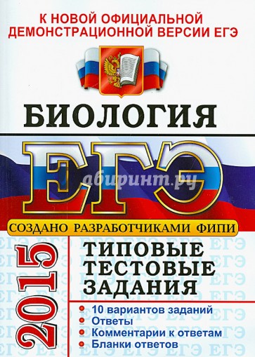Типовые тестовые задания по биологии содержат 10 вариантов комплектов заданий, составленных с учетом всех особенностей и требований Единого государственного экзамена в 2015 году. Назначение пособия - предоставить читателям информацию о структуре и содержании контрольных измерительных материалов 2015 г. по биологии, их отличии от предшествующих лет, степени трудности заданий.