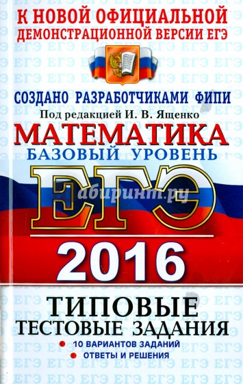 Типовые тестовые задания по математике содержат 10 вариантов комплектов заданий, составленных, с учетом всех особенностей и требований Единого государственного экзамена базового уровня в 2016 году. Назначение пособия - предоставить читателям информацию о структуре и содержании контрольных измерительных материалов 2016 г. по! математике базового уровня, степени трудности заданий. В состав авторского коллектива входят специалисты, имеющие большой опыт работы в школе и вузе и принимающие участие в разработке тестовых заданий для ЕГЭ.