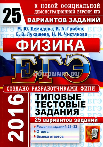 Типовые тестовые задания по физике содержат 25 вариантов комплектов заданий, составленных с учетом всех особенностей и требований Единого государственного экзамена в 2016 году. Назначение пособия - предоставить читателям информацию о структуре и содержании контрольных измерительных материалов 2016 г. по физике, а также о степени трудности заданий.
