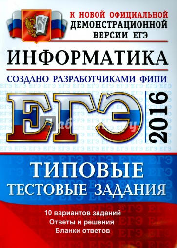 Типовые тестовые задания по информатике содержат 10 вариантов комплектов заданий, составленных с учетом всех особенностей и требований Единого государственного экзамена в 2016 году. Назначение пособия - предоставить читателям информацию о структуре и содержании КИМ 2016 г. по информатике, степени трудности заданий.