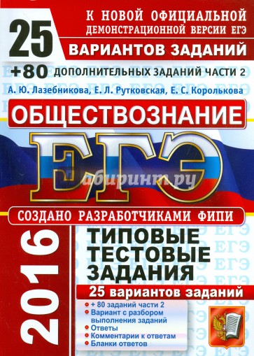 Пособие содержит 25 вариантов типовых тестовых заданий по обществознанию, а также 80 дополнительных заданий части 2. Все задания составлены с учетом особенностей и требований Единого государственного экзамена в 2016 году.