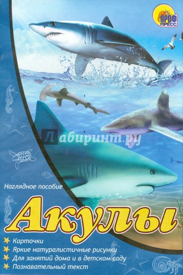 Наглядное пособие по акулам содержит карточки с яркими натуралистичными рисунками и познавательным текстом для занятий дома и в детском саду.