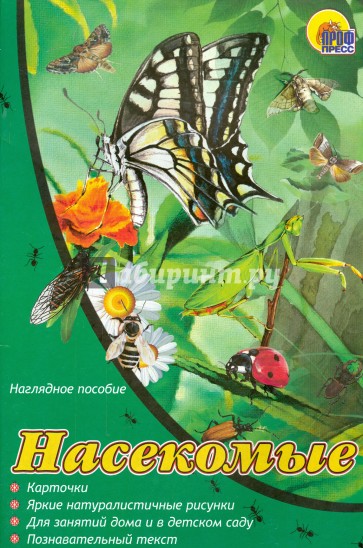 Наглядное пособие по насекомым содержит карточки с яркими натуралистичными рисунками и познавательным текстом для занятий дома и в детском саду.