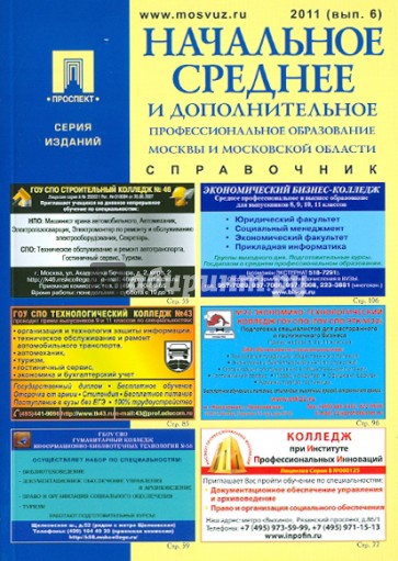 Справочник для старшеклассников и их родителей. Полная информация об учебных заведениях начального среднего и дополнительного профессионального образования Москвы и Московской области. Сведения об учебных заведениях изложены в простой и доступной форме, позволяющей без усилий найти нужные специальности.