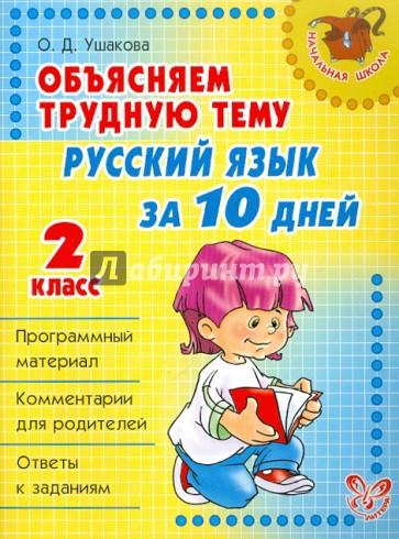 В пособии представлен основной программный материал по русскому языку для учащихся 2 класса, разбитый на 10 занятий. Пособие адресовано родителям второклассников, у которых по тем или иным причинам имеются в знаниях пробелы. Все задания и упражнения направлены на то, чтобы восполнить эти пробелы в ходе занятий родителей с детьми. В книге есть комментарии для родителей и ответы на приведённые задания.