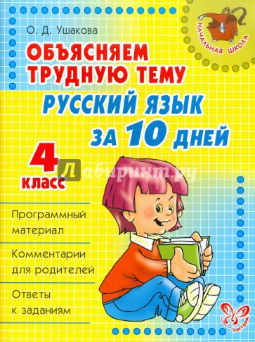 В пособии представлен основной программный материал по русскому языку для учащихся 4 класса, разбитый на 10 занятий. Пособие адресовано родителям четвероклассников, у которых по тем или иным причинам имеются в знаниях пробелы. Все задания и упражнения направлены на то, чтобы восполнить эти пробелы в ходе занятий родителей с детьми. В книге есть комментарии для родителей и ответы на приведённые задания.
