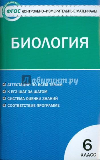 В пособии представлены контрольно-измерительные материалы (КИМы) по биологии для 6 класса. Все задания соответствуют школьной программы и требованиям ФГОС. Структура КИМов аналогична структуре тестов в формате ЕГЭ, что позволит постепенно подготовить учащихся к работе с подобным материалом. В конце издания предложены ключи к тестам.