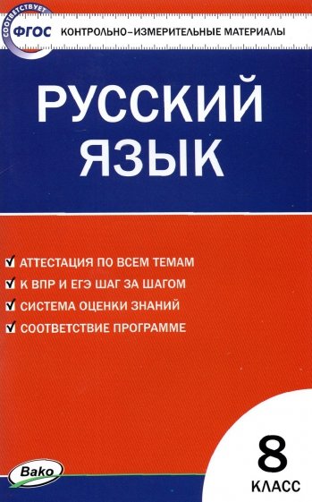 Содержащиеся в пособии контрольно-измерительные материалы (КИМы) для 8 класса, аналогичные материалам ЕГЭ, составлены в соответствии с Программой общеобразовательных учреждений по русскому языку и учитывают возрастные особенности учащихся. В конце пособия даны ответы на все варианты тестов, предложены диктанты и изложения различных типов, индивидуальные задания.